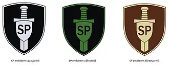 The badge of an active soldier who has completed military police training and serves in the military police is carrying SP and MP badge with silver glowing letters on a black background. Badge SP is used on performing tasks inside Estonia and MP badge is used outside of Estonia in foreign missions.