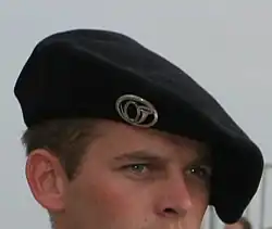 The history of the military berets in the Czech military dates back at least to the World War I, when the Czechoslovak legionaires in France wore the standard field blue military berets as part of their uniforms.[27] After the war and foundation of the First Czechoslovak Republic, the whole uniform continued to be used for ceremonial purposes by the Prague Castle guard. During the World War Two, the Czechoslovak soldiers serving in the 1st Czechoslovak Independent Armoured Brigade wore the standard British combat uniforms, including the black beret for armoured corps, with Czechoslovak insignia.[28]