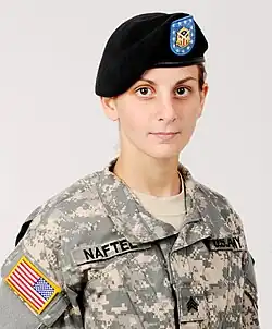 Starting in the 1970s, a special female beret was authorized for wear as alternate headgear for the Army, Air Force, Navy, and Marine Corps with various service uniforms.[84][85][86][87] The Navy was the last service to remove the female beret from their uniform regulations in 2015.[88] These black (Army and Navy), dark-blue (Air Force), and dark-green (Marine Corps) female berets were of similar design and worn on the crown of the head.[84][85][86][87][89] These service members wore their traditional cap devices on these female berets but unlike today's Army and Air Force beret flashes, these devices were worn center-forward on the beret with the exception being the Navy who wore their devices centered over the left eye.[84][85][86][87][89]