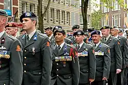 In all service branches, the beret is "bashed" to the right and a badge or insignia is worn above the left eye. In the army, all units can wear them with certain units wearing unique ones.[13] In the navy, the beret is an optional item[14] and in the air force, it is only worn by certain units.[15]