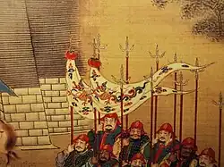 Princes of the Imperial family were also granted substantial military authority in strategic points around the empire. Each was granted an estate with the power to recruit military officers for their personal staff (this was restricted in 1395) and held total judicial authority over them. This ancient system, intended to provide military experience before deployment, had not been used in China for a thousand years.[42] Princes were also dispatched to join campaigns with their personal bodyguards. Zhu Di, Prince of Yan, impressed the Hongwu Emperor with his command of the 1390 campaign against the Mongols under Nayir Bukha and was allowed to retain command of the 10,000 Mongol soldiers he had captured. This later aided the prince in his usurpation of the throne. In some cases the princes were appointed to fill vacant command positions. Zhu Gang, the Prince of Qin, was sent to build military colonies (tuntian) beyond the Great Wall.[43] Princes were granted an escort guard (huwei bing) under their personal control, while a court-appointed officer commanded the shouzhen bing or garrison force, over which the princes only had authority during emergencies declared by the Emperor. This dual chain of command was meant to prevent a coup d'état in the capital. The garrison force could only be deployed with an order carrying both the Emperor's and the Prince's seal. The Regional Military Commission armies were then used to check the princes' military power. Many princes amassed large bodyguard forces and transferred regular soldiers to their personal command without authorisation anyway, using them on campaign.[44] The authority of princes was curtailed by the Jianwen Emperor. When the Yongle Emperor came to power, he further purged his brothers on trumped up charges and abolished most of the princely guards; by the dynasty's end there were less than a dozen extant. He also established a hereditary military nobility from his top generals during his usurpation, both Han Chinese and Mongol. They were however denied long-term commands so as to prevent personal power bases from forming.[45]