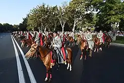 On 10 December 2020, a victory parade was held in honor of the Azerbaijani victory in the Second Nagorno-Karabakh War.[16] A group of the military servicemen who distinguished themselves during the Patriotic War (how the conflict is referred to in Azerbaijan) marched in the parade and showcase military equipment, unmanned aerial vehicles and aircraft, as well as war trophies. 3,000 servicemen marched in the parade, which included a contingent from Turkish Special Forces Command march on the square.[17][18][19] Turkish President Recep Tayyip Erdoğan attended as part of a state visit to Baku.[20][21][22] A military spokesperson described it as "the first important event in the history of Azerbaijan’s development, since the Victory Parade has never taken place in Azerbaijan and Freedom Square has never seen the Victory Parade".[23] In response to reports by Armenian social media that Armenian captives would take part in the parade, the State Security Service of Azerbaijan rejected the information as false saying that "humiliating prisoners of war is not a characteristic of the Azerbaijani people and our victorious army".[24]