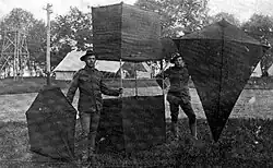 The first kite used by the United States Army Signal Corps specifically for raising an antenna was designed and built by Sergeant Thomas I. King, Signal Corps Company A, while stationed at Fort Leavenworth, Kansas, in 1905. The “King” kite was large, 7 feet high and 5 feet wide, made of 15 yards of white Japanese silk on a bamboo frame, and weighed less than 2 pounds.[2] Similar to Silas J. Conyne's kite of 1902,[3] it had a diamond shape with a squared-off top and bottom, keel, and large opening in the center to give it some of the stability of a box kite. It was used either singly or in trains of 2 to 4 kites or, on less windy days, in conjunction with a balloon to provide extra lift.