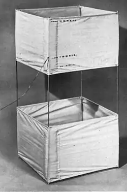 A second captured NSG2 was brought to the American army by the British, improved on and issued as the SCR-578-A "Gibson Girl" survival radio in 1942. It was carried by United States Army Air Forces aircraft and intended for use in life rafts. It included the M-277-A collapsible box kite to raise the antenna, which was also included in some of the later SCR-578-B sets. It was similar to the kite included with the NSG2 but did not include the wings. The 17 x 17 x 36 inch frame of the M-277-A was made up of 4 aluminum rods, each rod end was attached at the ends by a hinge to 4 shorter rods, and each of these met in the middle, attached by a locking mechanism, so that the whole thing could be opened up like an umbrella. The yellow cloth was treated with water repellent and part of one section filled with kapok to add buoyancy if it fell into the water.[14] It was designed to be simple to assemble, and could fly in winds from 7 to 40 miles per hour. It packed into a cardboard tube, on which were also printed the assembly instructions.