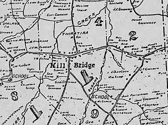 While there have been farmers and large plantations in the area since the mid-1700s, the community of Mill Bridge was not officially registered until 1874. The Mill Bridge post office existed from July 23, 1874, to September 30, 1903, with Mary E. McCubbin as the first postmaster. In the 1880s, Mill Bridge was a small prosperous agricultural community, centered around it historic Thyatira Presbyterian Church. After the Civil War, many freed slaves remained in the region, where there community was centered around the church, Oakland Presbyterian Church, which was established by the Northern Presbyterian Church.[1][2][3][4]