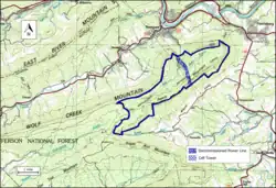 The area is located in the Appalachian Mountains of Southwestern Virginia, about 1 mile southwest of Pearisburg, Virginia and 1 mile south of Narrows, Virginia. Mill Creek runs through a valley formed between Pearis Mountain and Wolf Creek Mountain.[3][2] The Appalachian Trail crosses the southeast side of the area for eight miles as it travels south from Pearisburg/.[2] Docs Knob Shelter is at the southwest border where the Appalachian Trail leaves the area. A system of trails on the northeast can be accessed from the town of Narrows.[4]