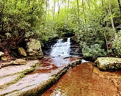 Mill Creek has a series of waterfalls, Mill Creek Falls, that extends over one-half mile beginning with a 45-foot rock stairway, followed by an 18-foot drop and finally a 10-foot fall. The falls can be seen from a trail along the creek maintained by the town of Narrows.[8] Mill Creek exits the valley through a narrow gap in Wolf Creek Mountain, then flows into Wolf Creek, a tributary of the New River.[1][3] The falls are located on the Mill Creek Loop hiking trail and contains three waterfalls, Mill Creek Falls, Mill Creek Dam, and Mercy Creek Falls, the loop is 7.8 miles and has an 1800 ft gain. Mill Creek Loop hiking trail reaches a maximum elevation at Sentinel Point and has a view of Wolf Creek Valley and the New River.