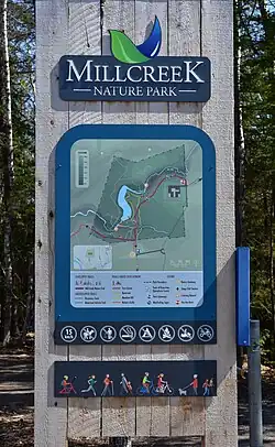 Mill Creek Nature Park has a network of developed and undeveloped trails, which are used for a wide array of activities, including walking and cycling in the summer and snowshoeing, fat biking, and cross-country skiing in the winter.[9] A scenic lookout above the reservoir includes a shelter, public fire pit, and benches, and is designated as one of the Fundy Biosphere Reserve's Amazing Places.[11] The park continues to see ongoing development and has become a popular destination for outdoor recreation in the Greater Moncton-area.