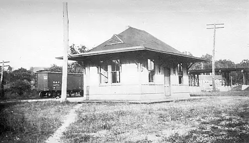 The station opened in 1881 to coincide with the expansion of the NY&NE line west to the Hudson River.[1] Mill Plain station had a long, low-level side platform that connected it to an adjoining freight depot,[2] which was also built in 1881.[1] The line became a part of the Central New England Railway in 1918.[1] The New York, New Haven, and Hartford Railroad acquired the line in 1927 and closed the station, and passenger service on the line the following year.[2] From 1930 up until 2018, the station building served as a residence and later a golf cart repair shop.[1] In 2018 the station building was bought by the Danbury Railway Museum and moved to their rail yard. The building is currently undergoing restoration.[2][3]