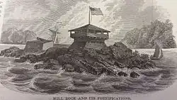 During the War of 1812, the War Department built a blockhouse with two cannons on Great Mill Rock as part of Fort Stevens. This fortification was part of a chain of blockhouses that was intended to defend New York Harbor and protect the passage into Long Island Sound against the British Navy.[1]