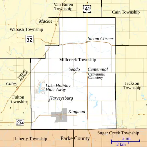 According to the 2010 census, the township has a total area of 42.94 square miles (111.2 km2), of which 42.71 square miles (110.6 km2) (or 99.46%) is land and 0.24 square miles (0.62 km2) (or 0.56%) is water.[4] It contains the town of Kingman in the southwest along Indiana State Road 234. The unincorporated community of Centennial, with its cemetery of the same name,[5] lies to the northeast on U.S. Route 41;[6] further north, at the intersection with Indiana State Road 32,[7] lies Steam Corner. Harveysburg is north of Kingman and Yeddo is west of Centennial.