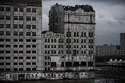 Along with Millennium Mills, there remains a small section of the now destroyed Rank Hovis Premier Mill and a restored grade II listed grain silo, labelled the 'D’ silo. Described by the Evening Standard in 2009 as a "decaying industrial anachronism standing defiant and alone in the surrounding subtopia",[3] the Millennium Mills has become a well-loved icon of post-industrial Britain and has made its way into many aspects of popular culture, being used as a backdrop in films and television shows such as Ashes to Ashes, London's Burning and Derek Jarman's The Last of England. Millennium Mills is also a destination for Urban Explorers despite high security, dangers of structural weakness, ten-storey drops and asbestos, and there are many reports and internal photos of the site.[3]