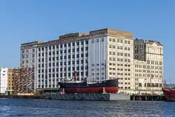 The Royal Docks closed in 1981,[14] and many businesses relocated to Tilbury.[4] The London Docklands Development Corporation (LDDC) was in discussion in the 1990s with the Zoological Society of London for a public aquarium on the site of the former CWS mill, but funding for it was difficult to find and the idea was eventually shelved.[4] The Rank and CWS mills were demolished by the LDDC in the 1990s, along with the Millennium Mills' B and C silos. The D silo to the south is Grade II listed.[15] Millennium Mills itself is locally listed by Newham Council.[16]