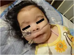 Photo of child with typical facial features of MDS, with small jaw, prominent forehead, bitemporal hollowing, short nose with upturned nares, prominent upper lip.
