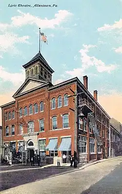 The Lyric opened with a comic opera production based on the life of 18th century Prussian King Frederick the Great.[3] The theater offered vaudeville, operas, plays, dramatic skits, minstrel shows, films and concerts, and also became one of the leading burlesque halls in the United States.[2] On December 1, 1910, French actress Sarah Bernhardt made a one-night appearance at the Lyric.[4] In 1912, it was the site of speeches by Theodore Roosevelt, Woodrow Wilson and Booker T. Washington.[5] Close to the Lyric at 35 North Sixth was the Orpheum Theater, which opened in 1906. While the Lyric presented primarily stage plays, the Orpheum was the first major vaudeville theater in Allentown. It presented variety shows that mixed jugglers, song-and-dance teams, acrobats, comedians with other performers.[4]