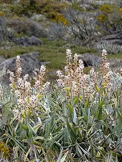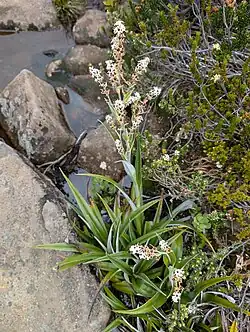 Milligania lindoniana is a tufted perennial herb, with wide, triangular, pleated leaves and dense rhizomes that can form matted colonies.[1] It is superficially similar to the closely related Astelia alpina (pineapple grass), which has a similar habit, but forms larger mats and occurs in similar wet habitat.[5] Although the leaves resemble Astelia alpina, the flowers of Milligania differ in that they are held above the leaves on a long scape, or stem.[1][3] Although it often grows to 40cm high, plant size and number of flowers can be variable, with some individuals much smaller.[3]
