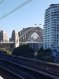 In 1915, to enable a start on the construction of the Sydney Harbour Bridge between Milsons Point and Dawes Point, the Government instructed the Railway Commissioners to vacate the station and a new four platform, station was constructed at the site of the boundary fence between the present-day Luna Park and Lavender Bay Sidings. This station was in operation for just seven weeks, from 30 May 1915 to 18 July 1915, as the inconvenience to passengers transferring between ferries and trains was unacceptable.[10] Due to later overcrowding, a third platform was added on 12 December 1920 by removing the centre road track and laying a new track on inland side of the new platform 2.[11] This station remained in use until the site was requisitioned to allow construction of the Sydney Harbour Bridge.
