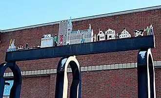 Painted Steel, 18' high x 20'1" wide x 5' deep. Although the piece is entitled Milwaukee, agricultural iconography is included. The sculpture reads from left to right, starting with the Milwaukee Lighthouse, a lighthouse keeper at the harbor breakwater and a seaman standing on duty aboard a Great Lakes freighter and a workman holding a shovel on top of a grain elevator. The Urban scene begins with city folk nearby the U.S. Bank Center (Milwaukee), followed by Milwaukee City Hall and houses typical of early German and Polish immigrants. The most western part of the sculpture ends with a mailman delivering mail to a typical mid-western farmhouse, a cow, and a farm couple.[1]