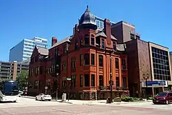 The Queen Anne-style building that currently houses the Milwaukee Club was constructed in 1884 and was designed by architect Daniel Burnham.[1] The estimated cost for the project was $60,000.[2] In 1893, architect Walter A. Holbrook was commissioned by the club to extend the building 18 ft (5.5 m) north.[3] During this process, the north wall of the building was demolished, and the roofline was reconfigured.[3][1] The building is also known for a distinctive corner turret that juts out from the rest of the clubhouse.[4]