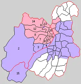 * yellow - areas formerly within the district borders during the early Meiji period