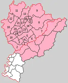 * yellow - areas formerly within the district borders during the early Meiji period