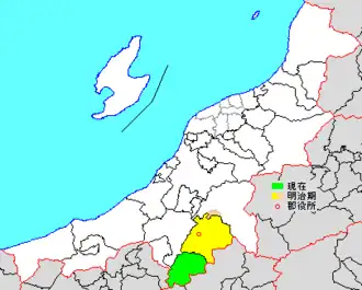 * yellow - areas formerly within the district borders during the early Meiji period