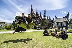 The peculiarities of Minangkabau dance are generally influenced by the Islamic religion, the uniqueness of matrilineal customs and the habit of migrating their communities also give a great influence on the soul of a classical dance that is classic, characteristics of the Minangkabau dance are fast, loud, stomping, and dynamic, including tari pasambahan, tari piring, tari payung, and the tari indang. Meanwhile, there is also a performance typical of other Minangkabau ethnic groups in the form of a unique blend of martial arts called silek with dancing, singing and acting known as Randai.[17]