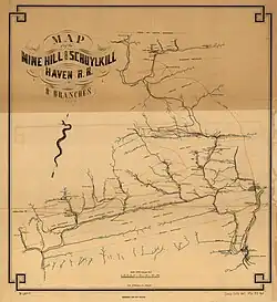 The Mine Hill & Schuylkill Haven Railroad (MH&SH) was operating by April 1831 in Schuylkill County, Pennsylvania, from above Mine Hill Gap (north of Minersville) to Schuylkill Haven on the Schuylkill Canal.[1] This railroad was developed by the New York and Schuylkill Coal Co.,[2] and was one of the important early "lateral" railroads of Schuylkill County which were constructed to accommodate the Schuylkill canal (in this case located at Schuylkill Haven) with coal tonnage from the more remote areas where mines were operating.[3] In 1862 the MH&SH was leased by the Philadelphia and Reading Railroad Company (P&RR) and became part of its operation system.[4]