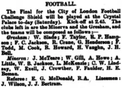 7. ^ "Grey Friars 0-3 Minerva". Sportsman: 4. 9 December 1878.