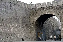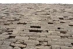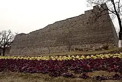 The inner city wall stood 11.4 m (37 ft) high and were topped with battlements that rose a further 1.9 m (6.2 ft).[11] The wall, lined with brick and filled with rammed earth, was 19.8 m (65 ft) thick at the foundation and 16 m (52 ft) at the top.[11] Bastions protruding on the outside face of the wall are locally known as mamian or "horse face". The bastions, spaced about 80 m (260 ft) apart, allowed archers to fire at attackers from three sides.[8] The restored fortification has 11 bastions on the southern wall and two bastions on the shorter eastern wall. Only the battlements of the corner tower and one bastion has been fully restored.