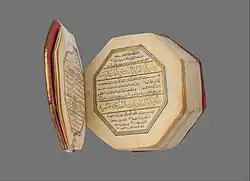 Thumbnail Quran (Arabic: مُصْحَفٌ مُصَغَّرٌ; Persian: قرآن بندانگشتی) or Miniature Quran are tiny-written Qurans having 2 types: Modern and Antique. Newer versions are produced in China, United Arab Emirates and Iran. But the antique versions can have almost 2 cm length, 1.5 cm width and 1 cm thickness. Some of them in hexagon or octagon shapes and with a metal box and a gilded leather wrapper.[1] Very antique versions have fragile papers may be foxed in contact with air. Many versions date back to the Ottoman Empire era in Turkey, in Egypt dating back possibly to the Khedivate of Egypt, and production of them in England during WWI.[2] Some are also written in different translations, such as Persian.