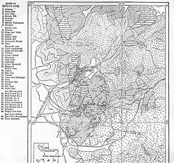 According to a 1904 dictionary of U.S. statutory language, "a mining district is a section of country usually designated by name and described or understood as being confined in certain boundaries, in which gold or silver or both are found in paying quantities, and which is worked therefor, under rules and regulations prescribed by the miners."[1] Per the U.S. Bureau of Mines, mining districts were initially organized "in the absence of all other authority," and there is no limit to the territorial extent which may be contained with any given district. Further, the bounds of a mining district can be readily changed "if vested rights are not thereby interfered with."[2] A 1935 mining report complained of "considerable difficulty" in determining "just what should constitute a mining district" for the purposes of the report, noting extremely wide variation in size and constantly changing names applied to associated or seemingly overlapping areas. The report concluded that an ideal mining district would be of moderate size, clearly defined, and contain geographically or geologically related ores. However in practice, local, historical and geological definitions of a mining district vary widely and may conflict.[3] An 1897 U.S. government report published during the Klondike Gold Rush differences noted differences in the definition American and Canadian mining districts: Americans established separate districts along every creek, whereas Canadians defined a "locality" as being a whole river and its affluents.[4]