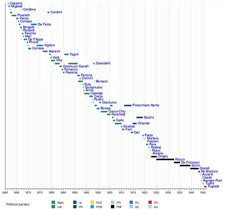 10 July 1873 | 25 March 1876 | 2 years, 259 days | Historical Right | Minghetti II | |||