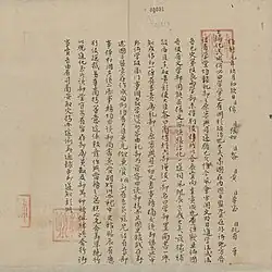 According to a document made on 09-01-Duy Tân 2 it was reported that the Học Bộ didn't have its own seals yet, so the Ministry of Education, Cao Xuan Duc, asked for a quan phòng seal for his office, 1 quan phòng seal for the Tham tri.[8] The ministry considers that the documents presented are in compliance with the implementation rules.[8] The seals were made by the Hữu ty and were made of bronze.[8] The Bộ ấn (部印) had the inscription Học Bộ chi ấn (學部之印) in seal script and was 9,0 cm x 9,0 cm.[19][8] Meanwhile, the kiềm ấn had the inscription Học Bộ (學部) in script and was 2,7 cm x 2,7.[19][8] The big seal was used to stamp the date while the smaller seal was used to close in important positions and erasing characters, among other tasks.[8]