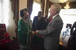 U.S. Secretary of the Navy Ray Mabus meets with Liberian President Ellen Johnson-Sirleaf at the Ministry of Foreign Affairs headquarters in Monrovia