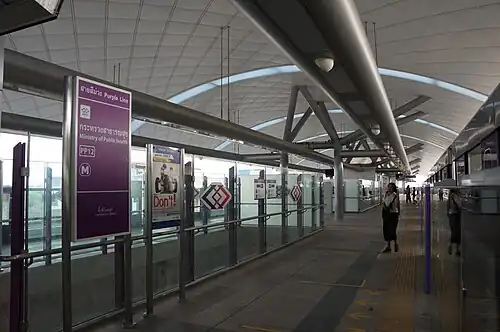 Ministry of Public Health station (Thai: สถานีกระทรวงสาธารณสุข, RTGS: Sathani Krasuang Satharanasuk) is a Bangkok MRT station on the Purple Line. The station opened on 6 August 2016 and is located on Tiwanon road in Nonthaburi Province.[1] The station has four entrances.[2] It is located near the headquarters of the Ministry of Public Health, in front of Srithanya Hospital.