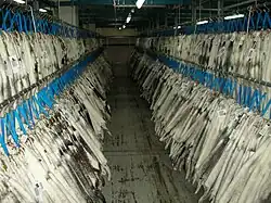 The mink industry in Denmark produced 40 percent of the world's pelts. Denmark used to be the largest producer of mink skins in the world.[1][2] Ranked third in Denmark's agricultural export items of animal origin, fur and mink skins have a yearly export value of about €500 million. Kopenhagen Fur, located in Copenhagen, is the world's largest fur auction house; annually, it sells approximately 14 million Danish mink skins produced by 2,000 Danish fur farmers, and 7 million mink skins produced in other countries.[3] Mink produced in Denmark was considered to be the finest in the world and is ranked by grade, with the best being Saga Royal, followed by Saga, Quality 1, and Quality 2.[3][4]