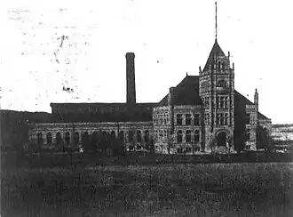 Designed by notable Omaha architects Mendelssohn, Fisher and Lawrie, the building was constructed at the Florence Water Works between 1888 and 1889. A large public opening was held August 1, 1889.[1] The main pumping station was a massive building of Warrensburg sandstone with a central tower rising four stories over the arched entrance. The building housed the high service pump and huge boilers that filtered water flowed to the city water mains.[2] The structure was 120 feet by 160 feet, and entirely illuminated by electric lights.[1]