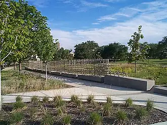 The memorial consists of a garden entitled Garden of Time: Landscape of Change and features a series of aluminum signs, each one of which describes an event in the United States women's suffrage campaign. A trellis bears the names of 25 leaders of the movement in Minnesota.[2][6]