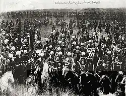 Some of the Twelver Shia Maraji' in the city of Najaf in the Ottoman Empire who had been pro constitutionalist prior to the bombardment of the parliament, issued Fatwas declaring the rule of Mohammad Ali Shah as unlawful and issued an order urging their followers to resist his rule.[25] Akhund Khorasani, Mirza Husayn Tehrani and Abdallah Mazandarani were among the people who declared the Shah's rule unlawful.[26] They declared paying taxes to the Shah's government as Haram and equivalent to waging war against the 12th Imam.[25]
