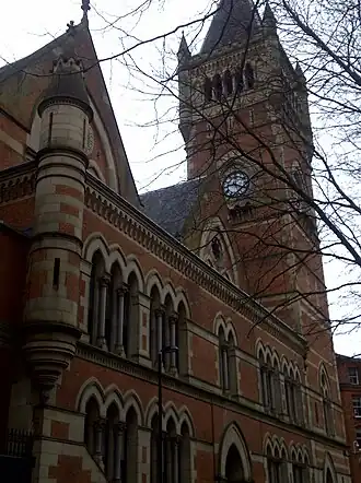 The building is in Worthington's trademark Gothic Revival style, with a massive corner tower and a chimney stack styled as a campanile. The courts are constructed in red brick with sandstone dressings and steeply pitched slate roofs. There is a profusion of animal carving by Earp and Hobbs.[6] Worthington drew both on his rejected designs for Manchester Town Hall, and on his earlier plans for Ellen Wilkinson High School, although the central tower he used there is placed asymmetrically at the Police Courts, due to the constraints of the site.[4] The interior court rooms "have been preserved with relatively few alterations."[4]