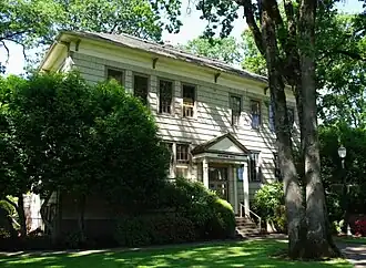 The Colonial Revival style structure has two above-ground floors and a daylight basement for a total of three floors.[2][7] Minthorn Hall's foundation is composed of bricks, with a coating of stucco on the exterior.[2] The building is a wood-frame structure built with rough-hewn lumber and with cedar shake siding.[2] Composition shingles are used on the roof.[2]