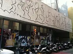 The curators of the exhibition, members of Studio PER, asked Joan Miró to do an art intervention for the exhibition at the headquarters of COAC, and he turned with enthusiasm, starting with the idea of painting a mural over all the windows of the ground floor of COAC Barcelona. The action was an ephemeral piece of art collective, and a demystification of the artist, in the spirit of Arte Povera,[5] ephemeral arts.[5] Miró chose four people to work with him, he gave them each a colour (yellow, green, blue and Red) and he gave them free rein to paint whatever they wanted. He reserved the black colour, which he applied with a stick as final intervention, retouching what the others had done only minutes before.