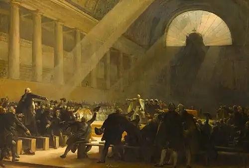 Mirabeau Replying to Dreux-Brézé or Mirabeau Before Dreux-Brézé is a c.1830 oil on canvas by Alexandre-Évariste Fragonard showing Mirabeau's response to Henri-Évrard de Dreux-Brézé (sent by Louis XVI to split up the Estates General of 1789) in the immediate aftermath of the Tennis Court Oath. It is now in the Louvre Museum, which bought it in 1984.[1][2][3]