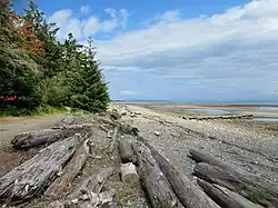 Miracle Beach Park comprises 137 hectares (340 acres), with approximately 665 m (2,182 ft) of shoreline along the Strait of Georgia on the east coast of Vancouver Island. The beach component of the park extends outward approximately 340 to 410 m (1,115 to 1,345 ft) from the shoreline to the tide's low water mark. The tide floods this sandy foreshore area twice daily. The extensive beach area is an intertidal sandbar, the result of coastal sediment transport from Williams Beach, and other nearby shorelines, driven by winds and waves from the southeast, as well as sediment from spilling out from Black Creek and Oyster River. Following this sediment transport pattern, the sands of Miracle Beach are being transported northward to Saratoga Beach. The shoreline is composed of a cobble and gravel surface with driftwood logs. Native species growing in the saline environment of the shoreline include gumweed, American dunegrass, Vancouver wildrye. The intertidal area is heavily trafficked by park visitors but animal life that can be found there include sand dollar, purple shore crab, green shore crab and green burrowing anemone. Coho Salmon swim up Black Creek from the sea in the fall.[13]
