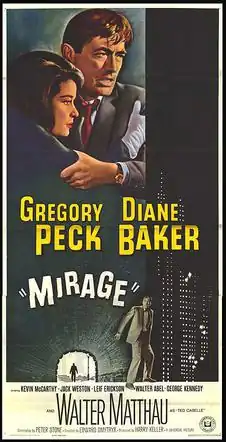 Mirage is a 1965 American neo noir thriller film starring Gregory Peck and Diane Baker, and released by Universal Pictures.[2] Directed by Edward Dmytryk[3] from a screenplay by Peter Stone, it is based on the 1952 novel Fallen Angel, written by Howard Fast under the pseudonym Walter Ericson; the novel is not credited by title onscreen.[4] Walter Matthau, George Kennedy, Leif Erickson and Kevin McCarthy appear in support.
