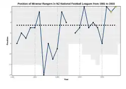 Miramar won the Chatham Cup, New Zealand's premier knockout tournaments for men, in 1966,[3] 1992,[4] 2004[5] and 2010,[6] and were Central League winners in 1997, 2006, 2008, 2011, 2013, 2014 and 2020.[1][7] Miramar also won the now-defunct club National League in 2002[8] and 2003;[9] the latter was the final National League season before it was revived again in 2021, which Miramar have since qualified for the Championship phase.[10]