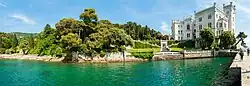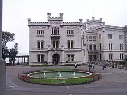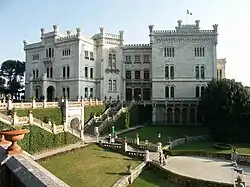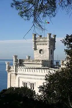 Miramare Castle (Italian: Castello di Miramare; Slovene: Grad Miramar; German: Schloss Miramar; Spanish: Castillo de Miramar) is a 19th-century castle direct on the Gulf of Trieste between Barcola and Grignano in Trieste, northeastern Italy. It was built from 1856 to 1860 for Austrian Archduke Ferdinand Maximilian and his wife, Charlotte of Belgium, later Emperor Maximilian I of Mexico and Empress Carlota of Mexico, based on a design by Carl Junker.