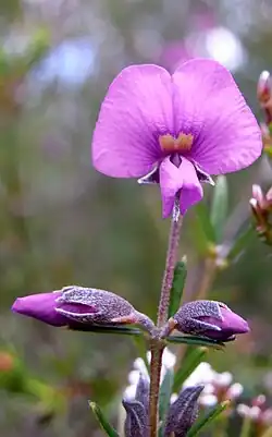 Mirbelia speciosa is a species of flowering plant in the family Fabaceae and is endemic to eastern Australia. It is an erect shrub with narrowly linear leaves arranged in whorls of three, and bluish-purple flowers usually arranged singly in leaf axils.