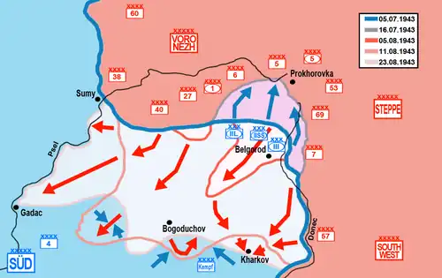 During the Battle of Kursk, German armored units south of the Kursk salient failed to penetrate the defences between the Voronezh and Steppe Fronts in the Belgorod sector on 8 July. The Red Army's Belgorod-Kharkov Strategic Counter-Offensive followed Operation Citadel and included as its objectives the immediate liberation of Belgorod and Kharkiv, assigned to the Voronezh and Steppe Fronts. On 23 July 1943, German forces of the XLVIII Panzercorps and LII Armeecorps returned to their old, well fortified positions, stretching to some 60 kilometres west of Tomarovka. Their combat strength had been reduced by as much as 50% following the Battle.[1][2]
